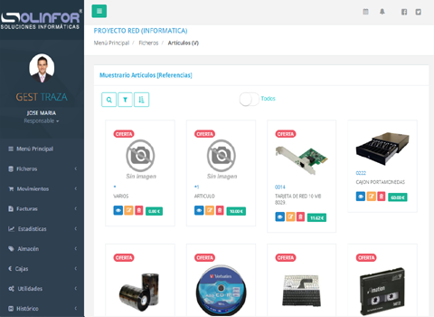 Muestrario de Articulos con fotografias, precios. Opcion de Filtrar por Familia, Buscar por varios campos y seleccionar articulos en oferta.